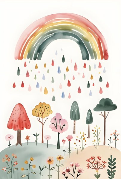 Affisch med ett motiv av en regnbåge som regnar färgglada droppar över ett landskap med olika träd och blommor. Färgerna är mjuka och akvarelliknande.