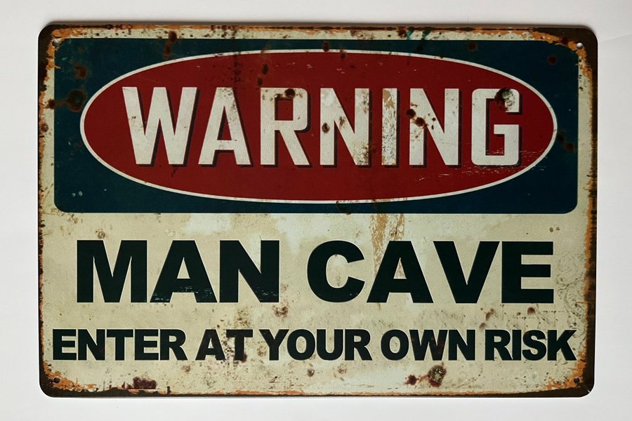 Dekorativ plåtskylt med texten ”Warning Man Cave Enter At Your Own Risk”.