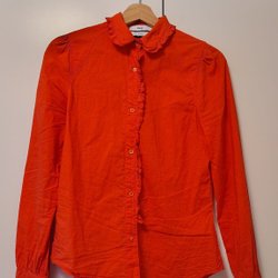 Beige jumpsuit med långa ärmar, krage och knappar framtill. Jumpsuiten har en avtagbar bälte i midjan och två fickor på bröstet.