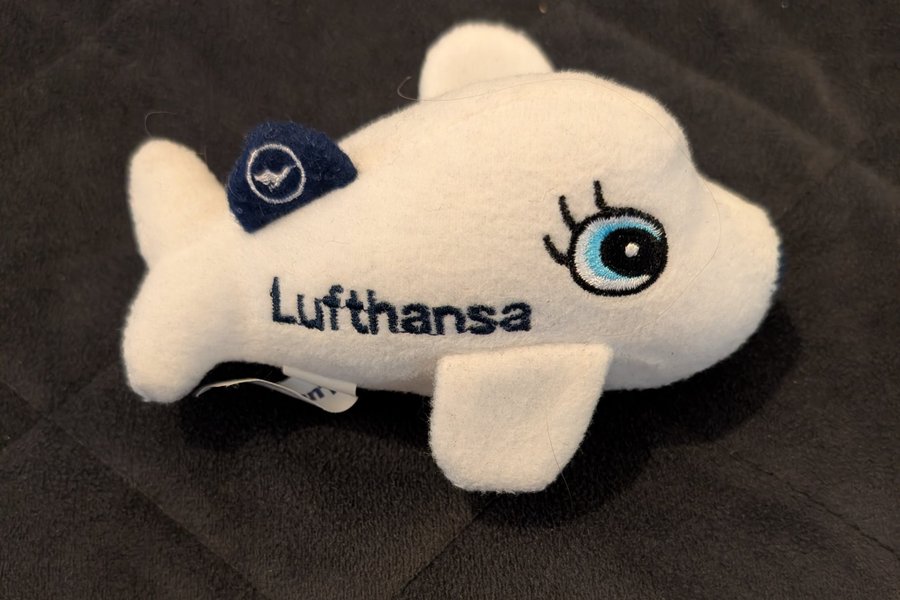 Vitt gosedjur format som ett flygplan med texten "Lufthansa" broderad på sidan. Gosedjuret har även broderade ögon i blått och svart samt en blå stjärtfena med Lufthansas logotyp.
