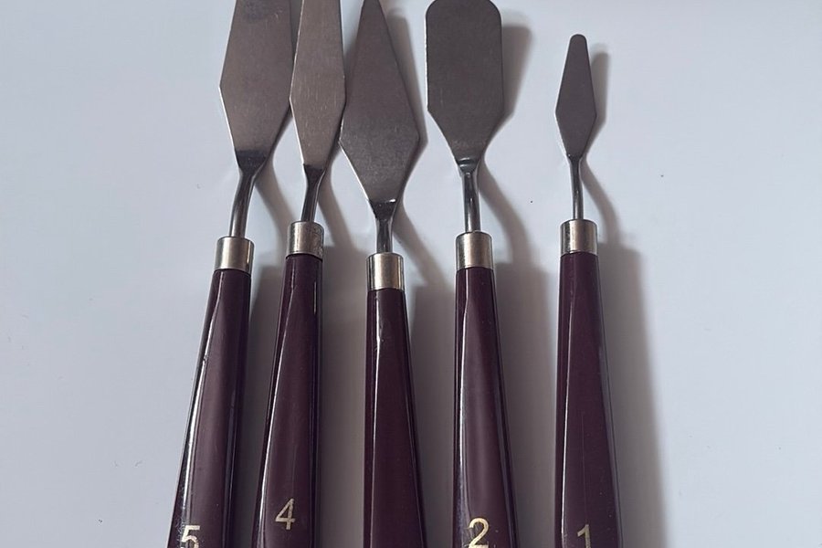 Palettknivar med handtag i mörk färg. Bladen har olika former för att passa olika tekniker. Handtagen är numrerade. Dessa verktyg är lämpliga för att blanda och applicera konstnärsmaterial.