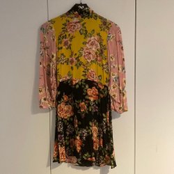Denna vackra klänning har ett blommigt mönster i mjuka pastellfärger. Den har en hög hals med rynkdetaljer och trekvartsärmar med volanger. Klänningen är avskuren i midjan med ett tunt band. Perfekt för både vardag och fest! Klänningen är magiskt vacker, st 34/36
