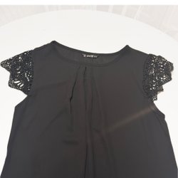 Svart klänning med korta ärmar och en figurnära passform. Klänningen har en rund halsringning och ett texturerat mönster. Troligt vis strl Xs men inga lappar finns kvar. Troligen eladtan och polyester