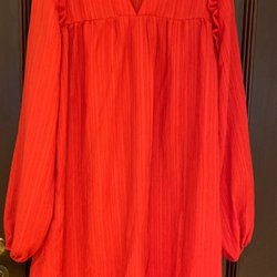 Röd klänning med långa ärmar och en dekorativ knutdetalj i midjan. Klänningen har en rund halsringning och en rak silhuett.