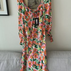 Grön och vit mönstrad klänning med puffärmar och fyrkantig halsringning. Klänningen har en vit kant runt halsringningen och ärmarna.