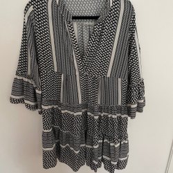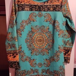 Fin avslappnad klänning med coolt mönster. Rak modell - bredd ca 97 och längd 87cm. I mkt fint skick. Storlek small