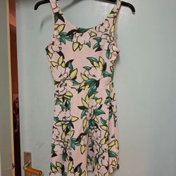 Rosa klänning med blommigt mönster. Klänningen har 3/4 ärmar och en elastisk midja. Den har en v-ringning med snörning och en kjol med dubbla volanger.