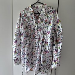Vit klänning med djup v-ringning och broderade blommor i rött och rosa. Klänningen har en enkel, rak modell.