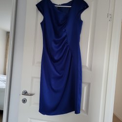 Grön klänning med korta ärmar och en unik halsringning. Klänningen har en figurnära passform och en elegant drapering framtill. Perfekt för både vardag och fest.