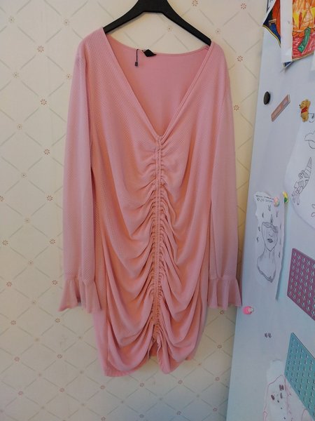 Rosa klänning med v-ringning och långa ärmar. Klänningen har en rynkad detalj framtill.
