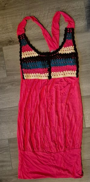 Rosa klänning med virkad detalj upptill och halterneck. Uppskattad stl S.