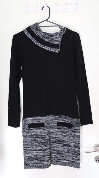 Svart stickad klänning med grått mönster i nederkant. Klänningen har en asymmetrisk krage . Bra skick.