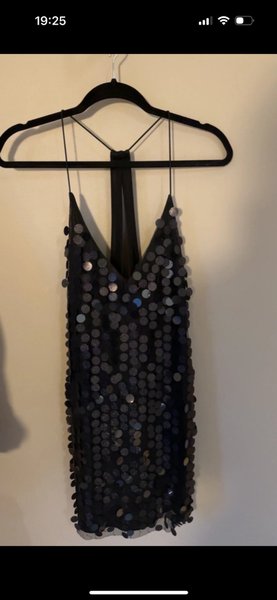Svart klänning med paljetter och smala axelband, storlek L. Ser ut som ny