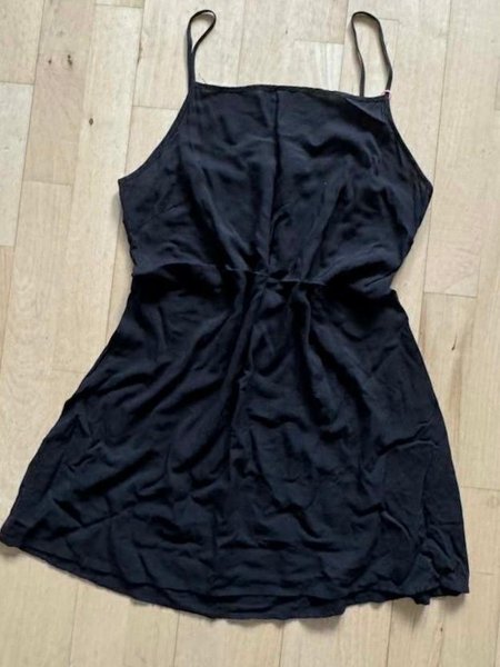 Kort, sort sommerkjole med tynde stropper. Tyndt stof