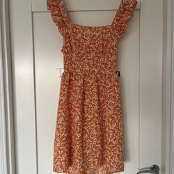 En klänning i en livlig orange färg. Klänningen har en enkel och stilren design med smala axelband och en rak skärning. Den är perfekt för varma dagar eller som en bas för att klä upp eller ner med olika accessoarer.