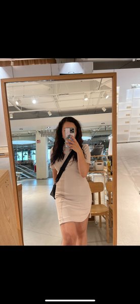 En kortärmad klänning i en ljus nyans. Klänningen har en figurnära passform och en rundad halsringning. Den har en diskret sömdetalj under bysten och en asymmetrisk nederkant som är något kortare framtill.
