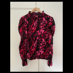 Klänning med långa ärmar och resår i midjan. Klänningen har en hög krage med volangdetaljer och en öppning baktill som försluts med en knapp. Ärmsluten är elastiska. Mönstret består av svarta prickar mot en grön botten.