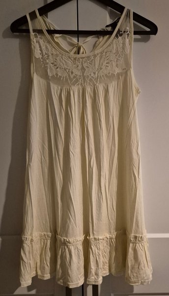 Ärmlös klänning i en ljus färg med spetsdetaljer vid halsen och en knytning i nacken. Stl S. Oanvänd.