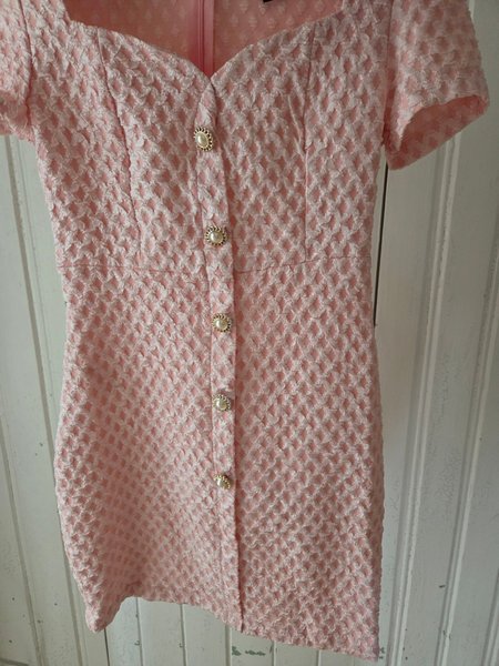 Rosa klänning med korta ärmar och dekorativa pärlknappar framtill. Klänningen har en figurnära passform och en söt, feminin stil.