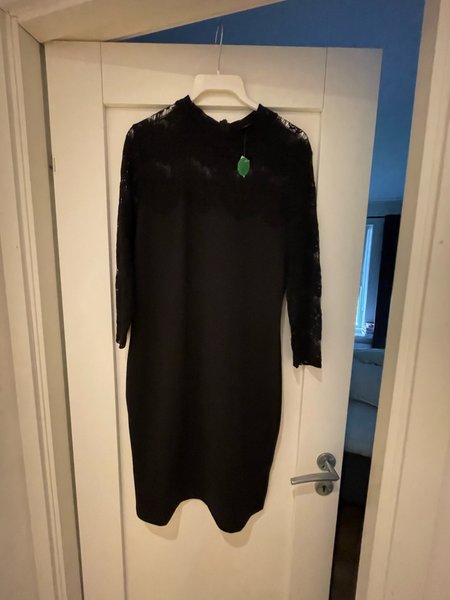 En svart klänning med spetsdetaljer på ärmarna. Klänningen är figursydd och har en rund halsringning.