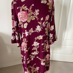 Vinröd klänning med långa ärmar och utsvängda ärmslut. Klänningen har en v-ringning bak och en rund halsringning fram.