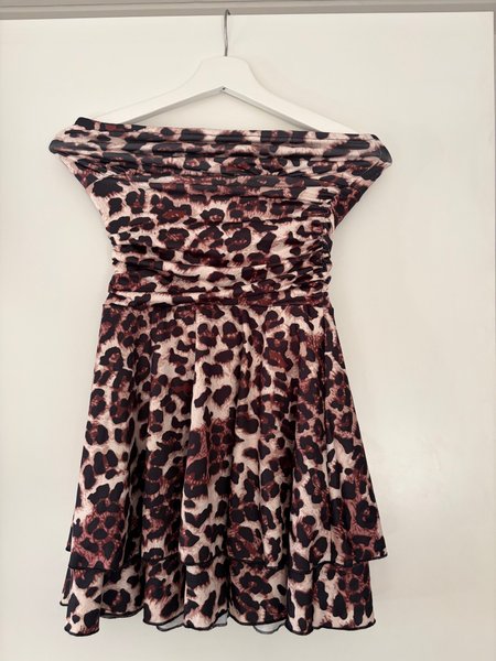 Klänning med leopardmönster. Klänningen är axelbandslös med rynkad överdel och en utsvängd kjol med volanger.
