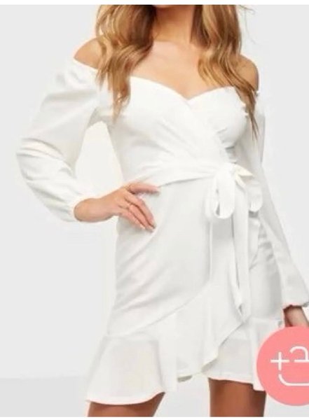 Vit omlottklänning med bara axlar och långa ärmar. Klänningen har en volangkant längs nederkanten och knyts i midjan för en smickrande passform. Min klänning är från Bubbelroom och har används endast en gång. Storlek 44/L??