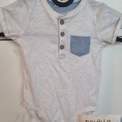 Vit babybody med en mörkblå krage och detaljer på ärmarna. Bodyn har två knappar framtill.