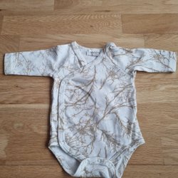 Vit body med långa ärmar och ett blommigt mönster i rosa toner. Den har en söt spetskant runt halsen och benöppningarna.