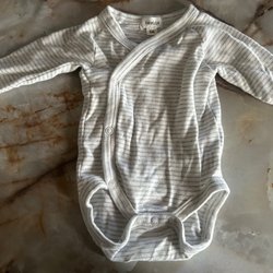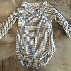 Vit body med korta ärmar och tryckknappar nedtill och vid ena axeln. Lite gulnad vid högersida hals, men inte jätte synbart…i övrigt i fint begagnat skick.