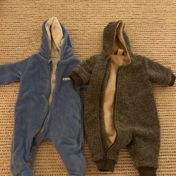Randig babyoverall med grå ärmar och knäppning framtill, hela vägen ner.