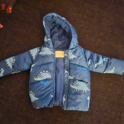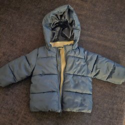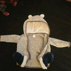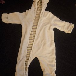 En blå overall med luva och dragkedja. Luvan är fodrad med ett beiget tyg och har små öron.