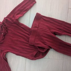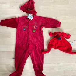 Röd sparkdräkt med detaljer som ska efterlikna en tomtekostym.