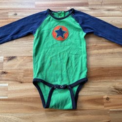 Blå body med långa ärmar. Bodyn har ett mönster med stjärnor och prickar på framsidan. Ärmarna har ett tryck med tecknade figurer och regnbågar.