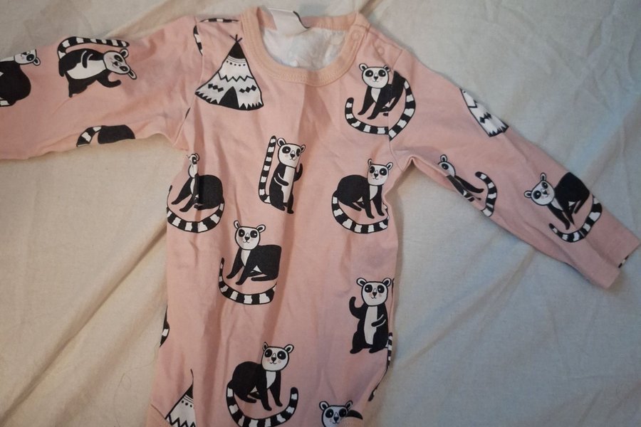 Söt rosa body med långa ärmar. Bodyn har ett mönster med lemurer och tält.