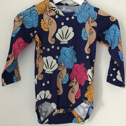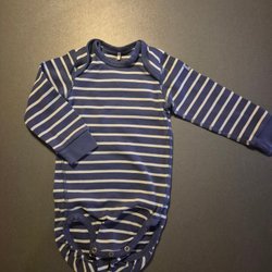 Blå body med långa ärmar. Bodyn har ett mönster med stjärnor och prickar på framsidan. Ärmarna har ett tryck med tecknade figurer och regnbågar.