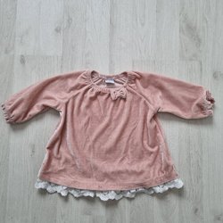 Vit babybody med en rund krage och volangärmar prydda med spetsdetaljer.