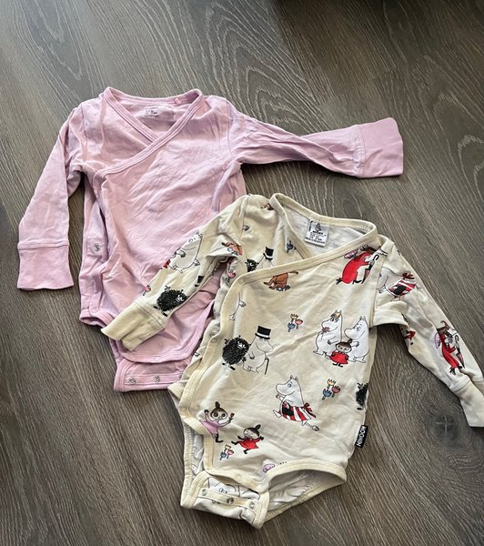 Två omlottbodys med lång ärm. En enfärgad rosa och en med Mumin-motiv.