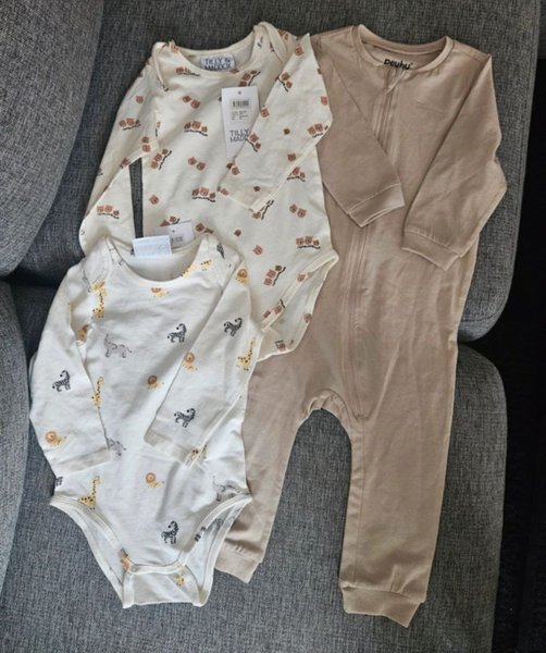 Tre långärmade plagg för bebis. Två bodys med tryck, en med björnar och en med savanndjur som giraffer, zebror, elefanter och lejon. Den tredje är en beige heldräkt med dragkedja framtill.