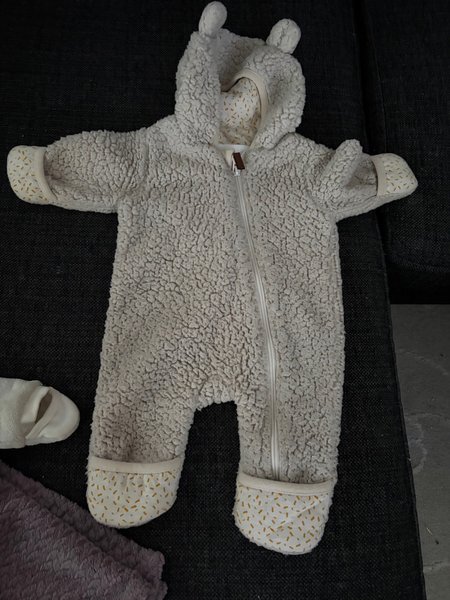 Overall med huva och dragkedja framtill. Huvan har små öron upptill. Ärmsluten och bensluten har ett mönstrat tyg i gult och vitt.