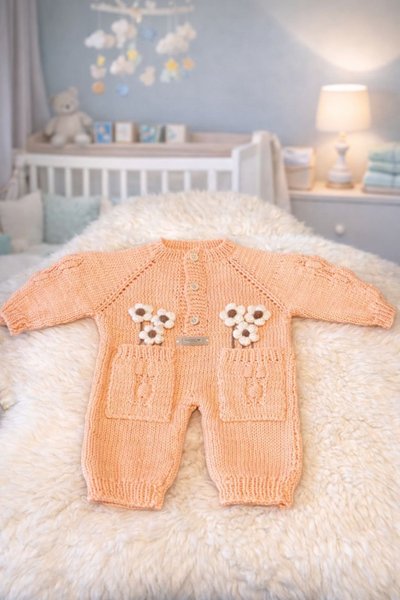 En stickad babyoverall i persikofärg med långa ärmar och ben. Overallen har en knappslå framtill med tre knappar och en rund halsringning. Det finns två fickor framtill, var och en dekorerad med tre små blommor i vitt och brunt. Ärmarna och benen avslutas med ribbstickade muddar.
