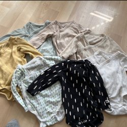 Ett paket med flera bodys i olika färger och mönster. Bodysarna har korta ärmar och tryckknappar i grenen för enkel påklädning. Storlekar 86,92, 98