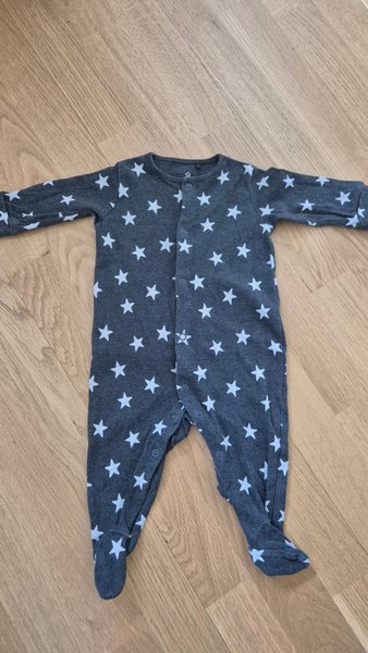 Helkroppsoverall med långa ärmar och ben. Overallen har tryckknappar längs hela framsidan för enkel påklädning och avklädning. Mönstret består av vita stjärnor jämnt fördelade över hela plagget. Fötterna är integrerade i overallen.