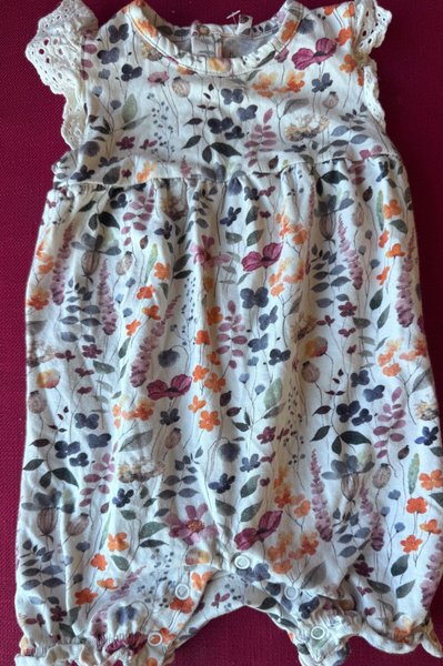 Vit sparkdräkt med ett färgglatt blommigt mönster över hela plagget. Sparkdräkten har korta ärmar med spetsdetaljer och knappar i grenen för enkel påklädning.