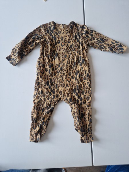 En långärmad leopardmönstrad sparkdräkt med tryckknappar framtill vid halsen och längs benen för enkel påklädning och blöjbyte. Dräkten har muddar vid ärmslut och benslut.
