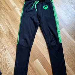 Ett par mörkblå byxor med resår och dragsko i midjan. Byxorna har en avslappnad passform och muddar nedtill.