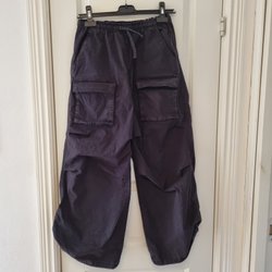Khakifärgade cargobyxor med vida ben, resår i midjan och fickor på benen samt bakfickor.