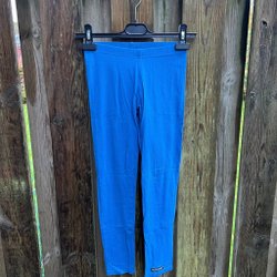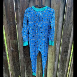 Ett par turkosa byxor med fickor fram och bak. Byxorna har en knapp och dragkedja framtill. Ekologisk bomull. Något tvättpåverkade.
