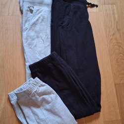 Två par byxor, ett par enfärgade svarta och ett par mörkgrå med blå stjärnor på knäna och röd dragsko.
