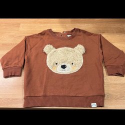 Bruna/beiga yxor med muddar och dragsko i midjan. Gulligt ansikte med utstående öron på baksidan. Gott skick, inga fläckar eller skador